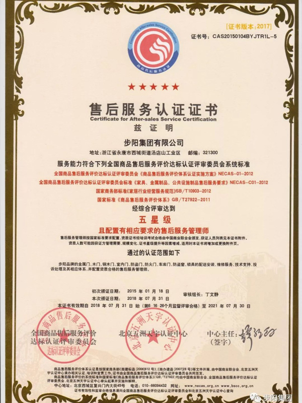 近日,在"全国商品售后服务体系项目"专家组评审中,黄瓜下载APP最新下载集团有限公司在金属门、木门、钢木门、室内门、防盗门、防火门、车库门、防盗窗、锁具的配送安装、维修服务、技术支持、投诉处理及其相应体系在内的全程售后服务内容,并配置资质合格的售后服务管理师,顺利通过了国家级4大评审标准,综合评审达到“五星级”!